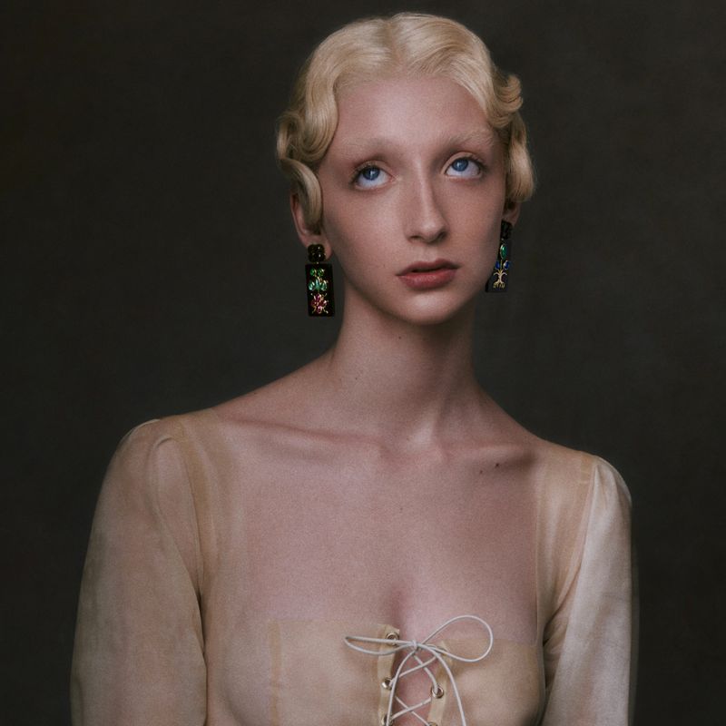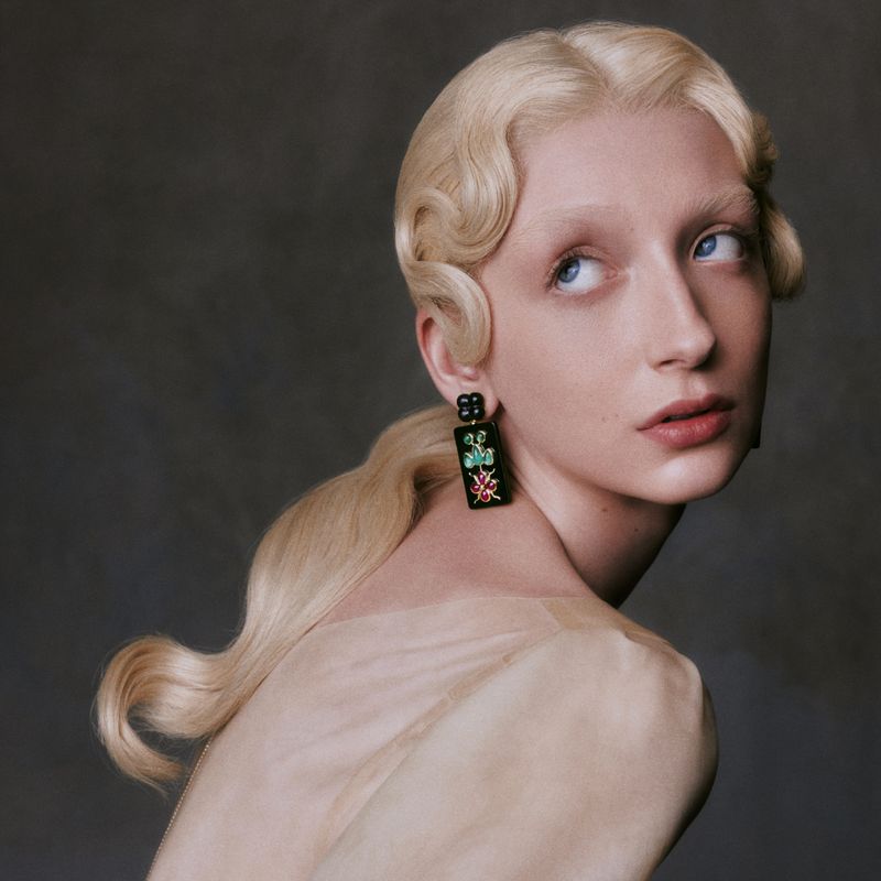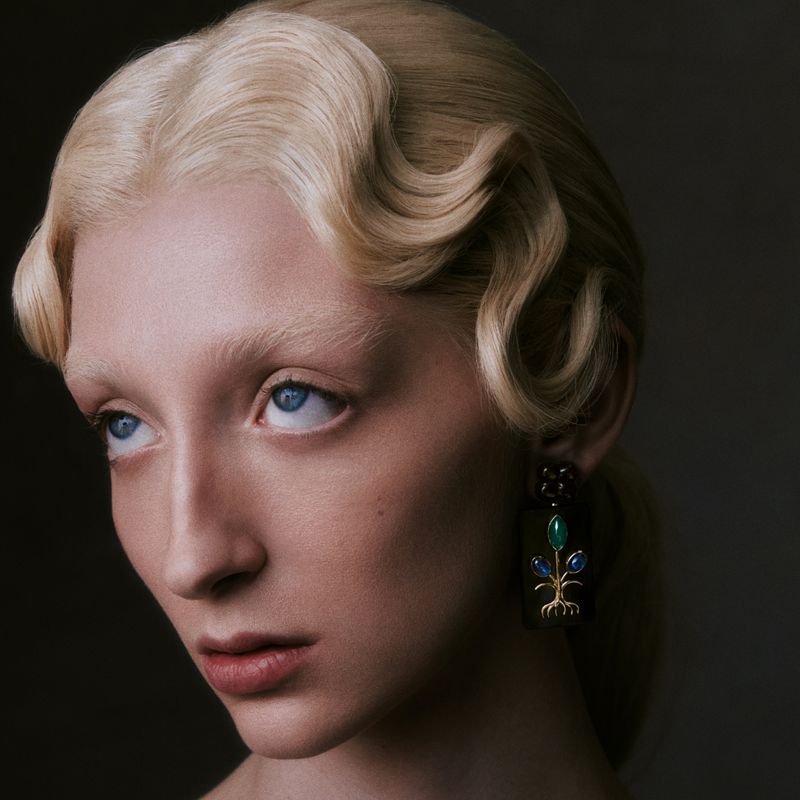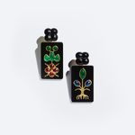 18k yellow gold earrings with emerald, ruby, sapphire, and horn.