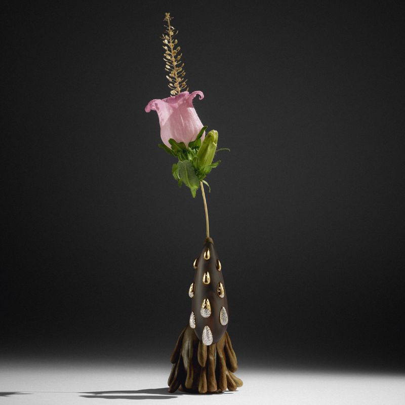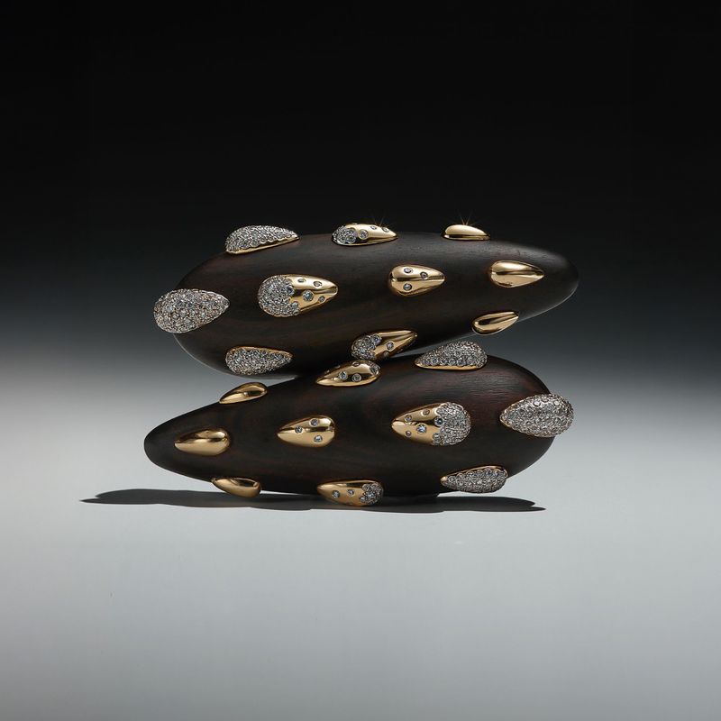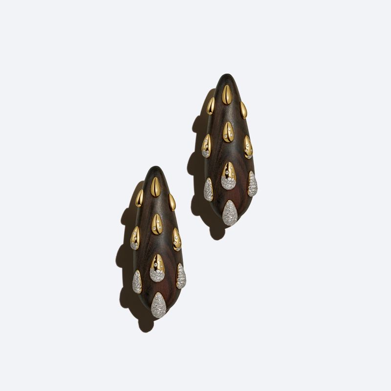 18k yellow gold earrings with wood and diamonds.