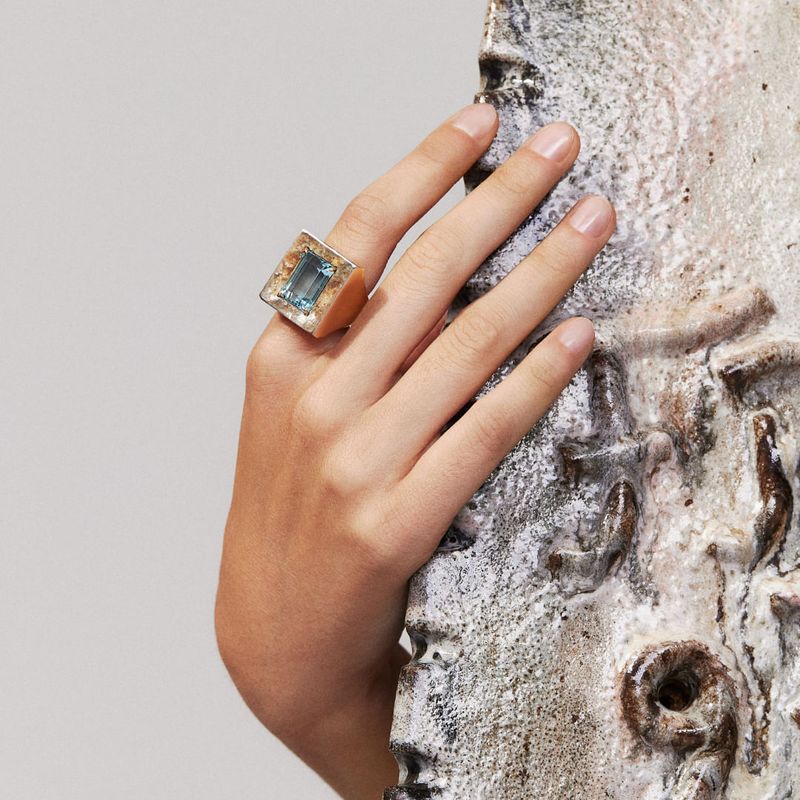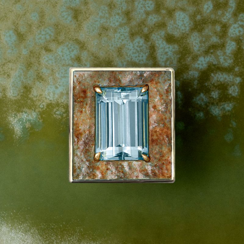 18k yellow gold ring with Brennand's ceramics and aquamarine.