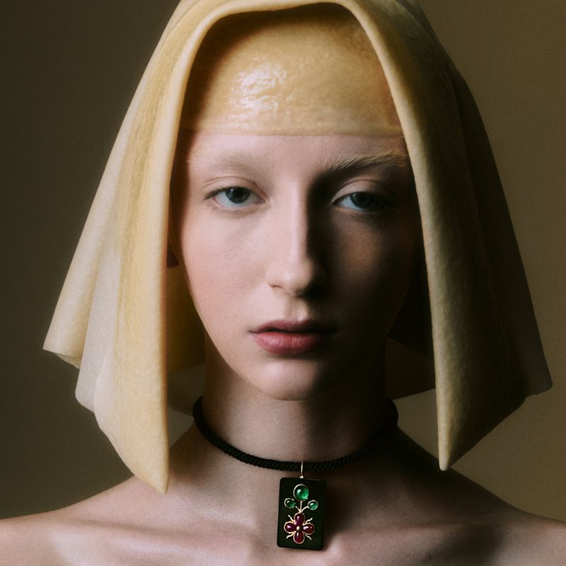 18k yellow gold earrings with emerald, ruby, and horn.