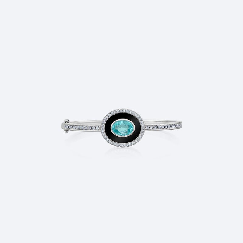 18k white gold bracelet with Paraiba tourmaline, onyx and diamonds.