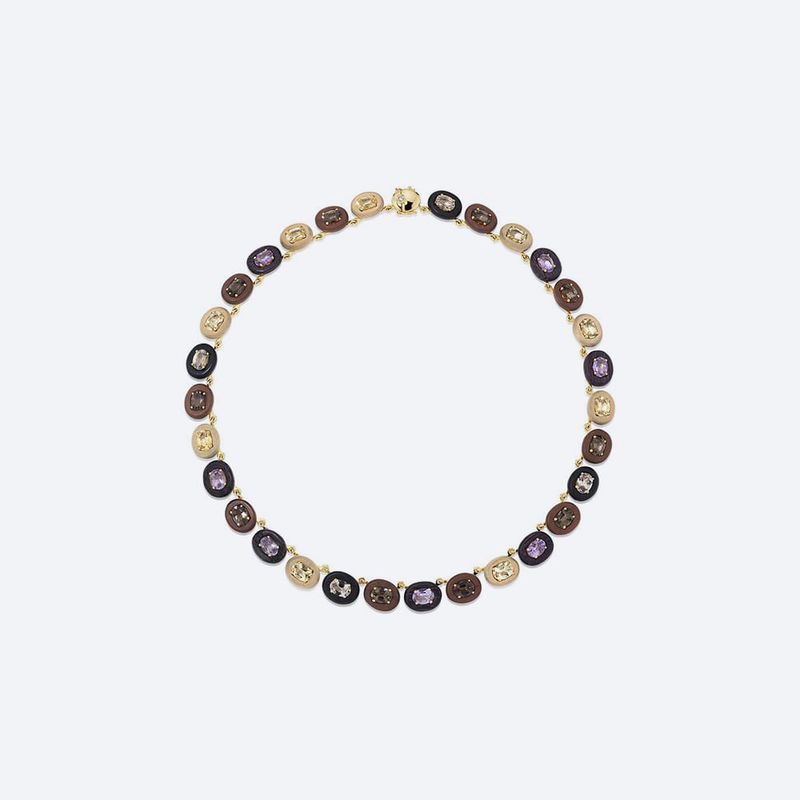 18k yellow gold necklace with amethyst, quartz, wood and diamond.